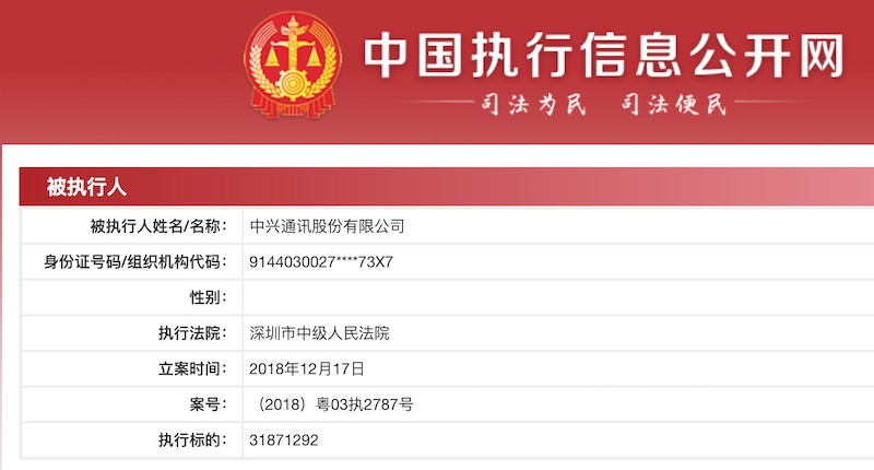 显现,中兴通讯股份有限公司于 12 月 17 日被深圳市中级人民法院列入被履行人名单,履行标的为 3187.13 万元。