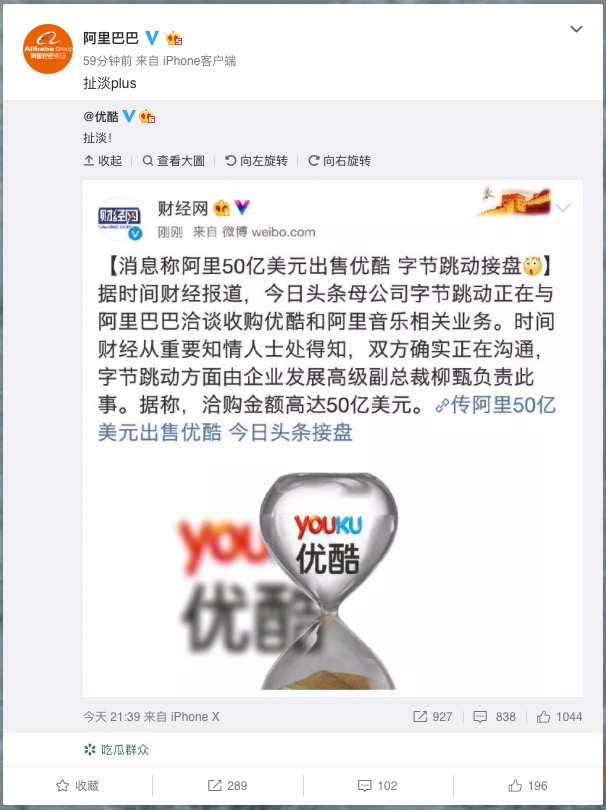 报导,有音讯称,今天头条母公司字节跳动正在与阿里巴巴洽谈收买优酷